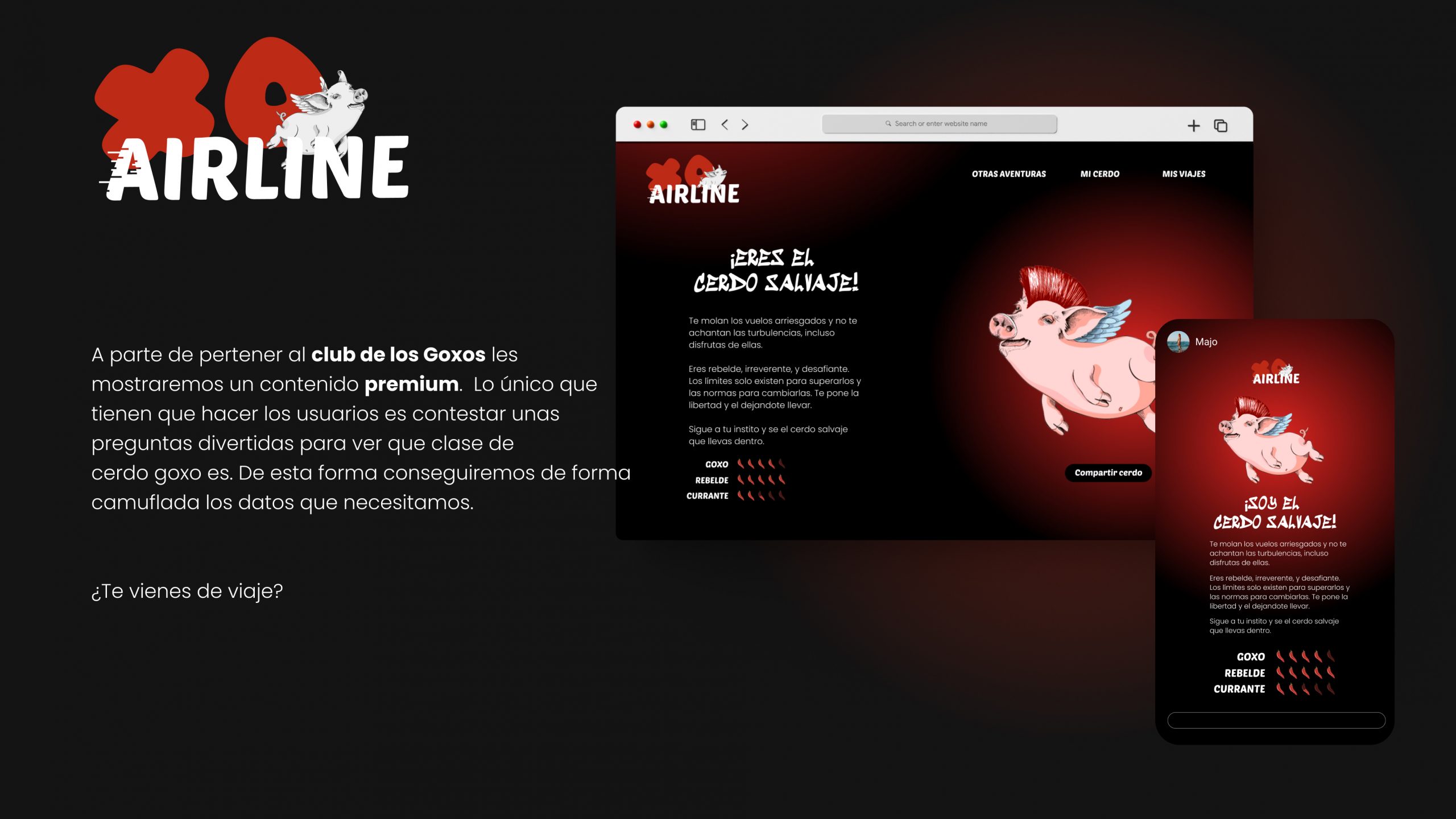 En esta aerolínea formarás parte del Club de los goxos donde podrás descubrir qué clase de cerdo volador eres y formar parte de esta comunidadA parte de conocer tu personalidad Goxo te diremos cuál debe  ser tu próximo viaje GOXO y te mostraremos contenido premium.